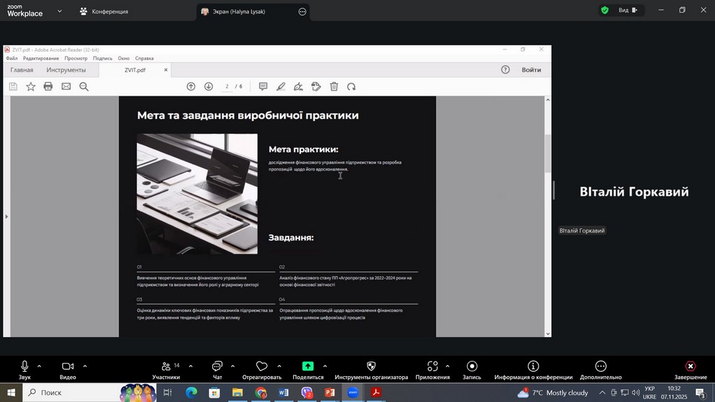 Захист звітів продемонстрував високий рівень підготовки магістрантів, їхню здатність до самостійних аналітичних досліджень і практичного розв’язання професійних завдань. Отримані результати стануть важливою основою для написання та захисту магістерських кваліфікаційних робіт.