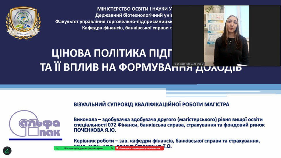 Кваліфікаційна робота за другим (магістерським) рівнем вищої освіти здобувачки Поченкової Янини на тему «Цінова політика підприємства та її вплив на формування доходів» (керівник роботи – Ставерська Т.О.) виконувалася на базі ТОВ «Альфа Пак-Схід» – підприємства, що здійснює діяльність у сфері продажу одноразового паперового та пластикового посуду, у головному офісі якого й відбувся безпосередній захист роботи.