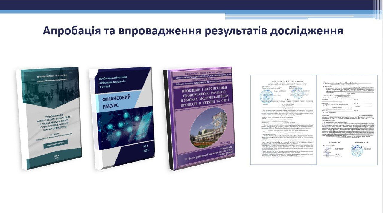 За результатами дослідження розроблено та впроваджено в діяльність підприємства методику вдосконалення гнучкої системи ціноутворення, а також сформовано стратегію впровадження інструментів цифрового моніторингу, зокрема CRM-систем, технологій Big Data та dashboard-аналітики (акт впровадження від 15 грудня 2025 р.). Запропоновані рішення спрямовані на підвищення аналітичної обґрунтованості управлінських рішень, оперативний контроль цінових показників, адаптацію до змін ринкової кон’юнктури та зростання доходів підприємства.