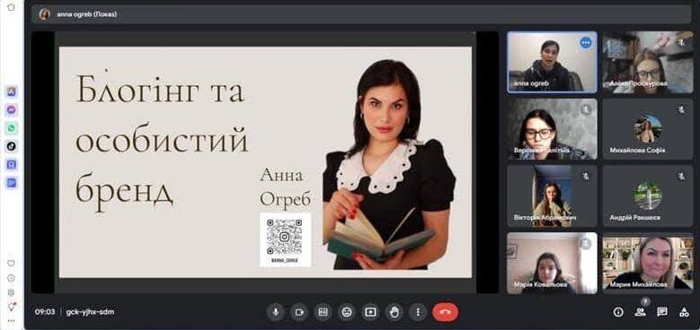 Під час онлайн-зустрічі обговорили, що таке особистий бренд, його складові, ведення блогу та застосування маркетингових інструментів. Пані Анна поділилася досвідом роботи в різних країнах, зокрема в Канаді, акцентувавши на можливостях, які відкриває професія маркетолога для онлайн-роботи.