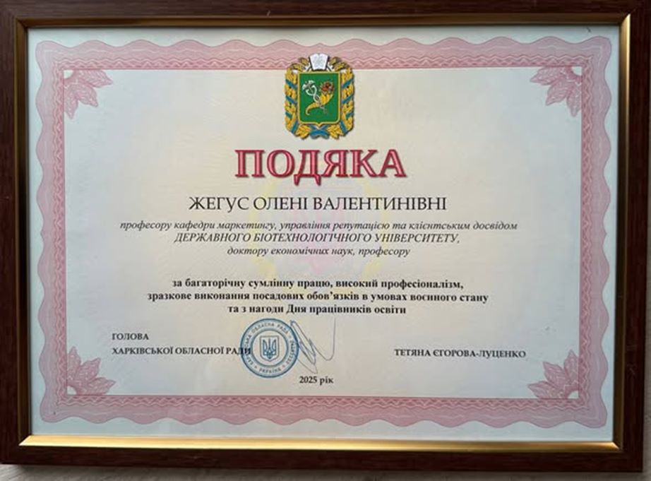 Кафедра маркетингу, управління репутацією та клієнтським досвідом вітає доктора економічних наук, професора Жегус Олену Валентинівну з відзнакою за багаторічну сумлінну працю та внесок у розвиток освіти від Голови Харківської обласної ради Тетяни Єгорової-Луценко!