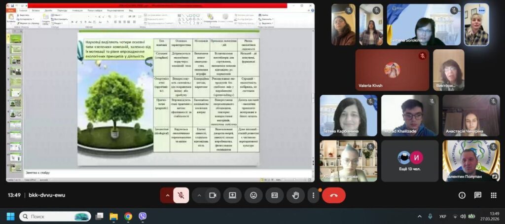 Під час лекції обговорено ключові аспекти сталого розвитку, екологічного маркування та сертифікації бізнесу, а також сучасні виклики у сфері екологічної безпеки, які постають безпосередньо як перед державою, так і перед виробничими, торговельними підприємствами та індустрією гостинності.