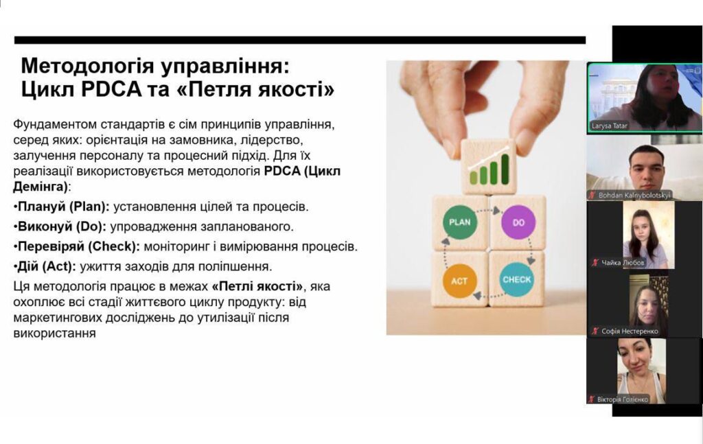 11 березня 2026 року відбулося чергове засідання постійно діючого студентського наукового гуртка «Інновації у сфері гостинності, торгівлі та виробництві харчових продуктів» факультету управління торговельно-підприємницькою та митною діяльністю під керівництвом к.т.н., доцента, ст. викладача Татар Лариси Василівни.Тема зустрічі «Сутність проблеми якості продукції та послуг в умовах сьогодення». Здобувачі першого (бакалаврського) рівня вищої освіти денної форми навчання академічних груп 076-22б-01, 076-23бстн-3-01, 241-22б-01, 241-23бстн-3-01приймали активну участь в обговоренні. За результатами проведеної роботи було прийнято рішення сформувати та подати до друку тези для участі в науковій конференції.