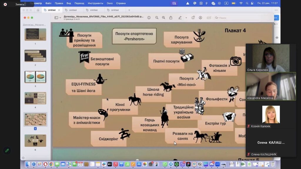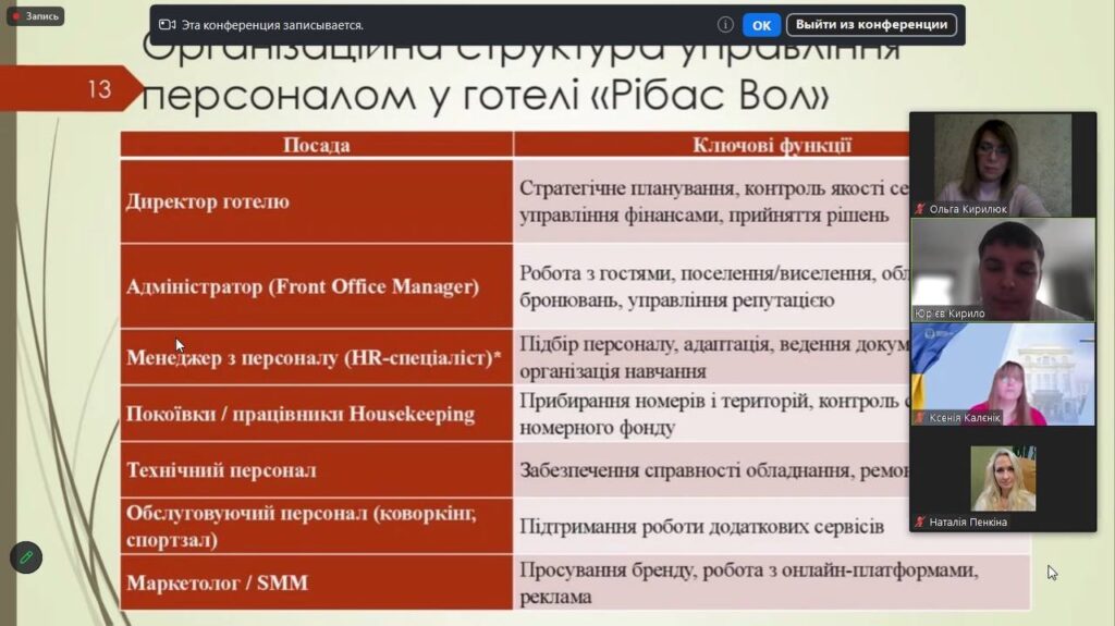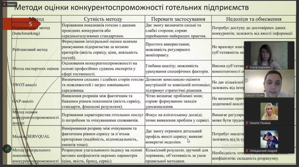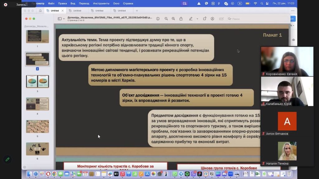 Під час захисту магістранти представили результати власних науково-практичних досліджень, присвячених актуальним проблемам розвитку готельно-ресторанного бізнесу, зокрема інноваційним форматам закладів гостинності, підвищенню конкурентоспроможності підприємств, управлінню якістю послуг, комунікаційній діяльності, впровадженню принципів сталого розвитку та європейських стандартів обслуговування.
