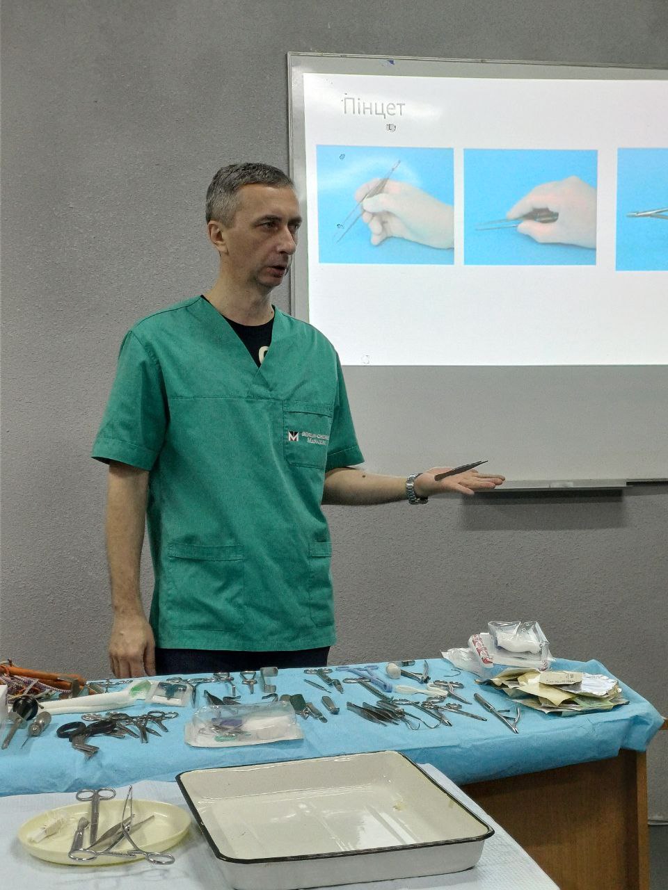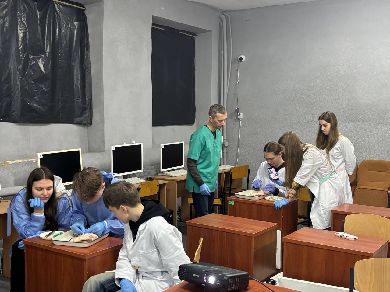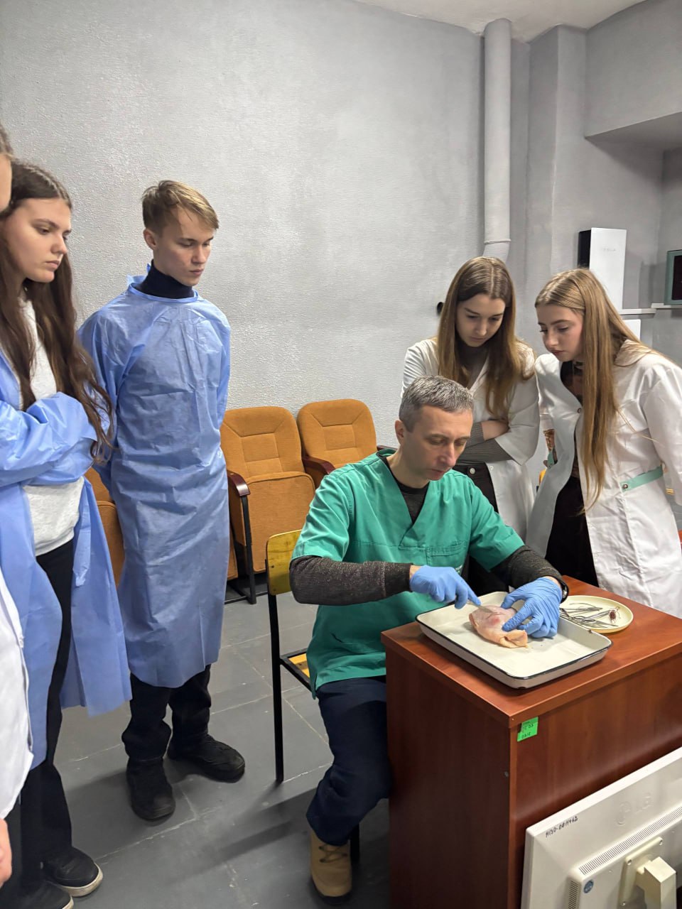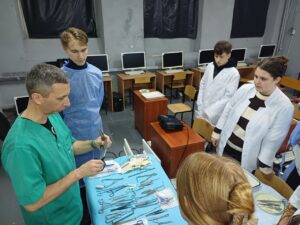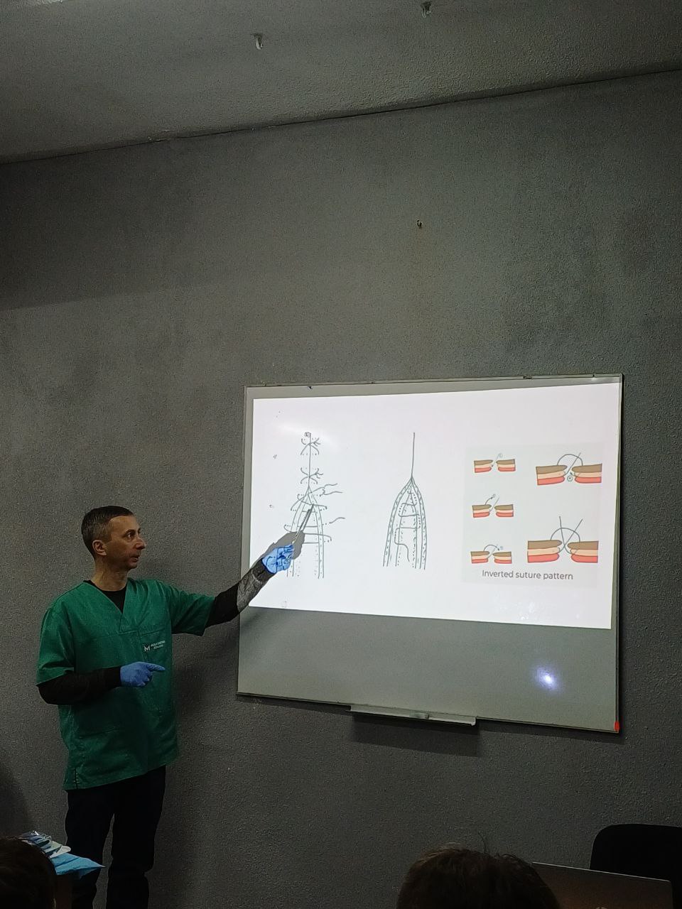 5 грудня 2025 року на базі ДБТУ професор Дмитро СЛЮСАРЕНКО провів практичне заняття за темою «Елементи хірургічних операцій» для здобувачів факультету ветеринарної медицини. Під час заняття студенти опрацьовували ключові практичні навички, які є невід’ємною частиною професійної підготовки майбутніх лікарів ветеринарної медицини ‒ методики фіксації морського та хірургічного вузлів, накладання переривчастих і безперервних швів, а також удосконалили володіння основним хірургічним інструментарієм. Це сприяло формуванню впевненості у володінні базовими техніками оперативних втручань і підвищенню рівня підготовленості студентів до майбутньої професійної діяльності.