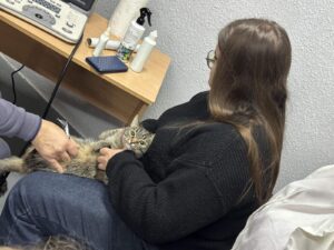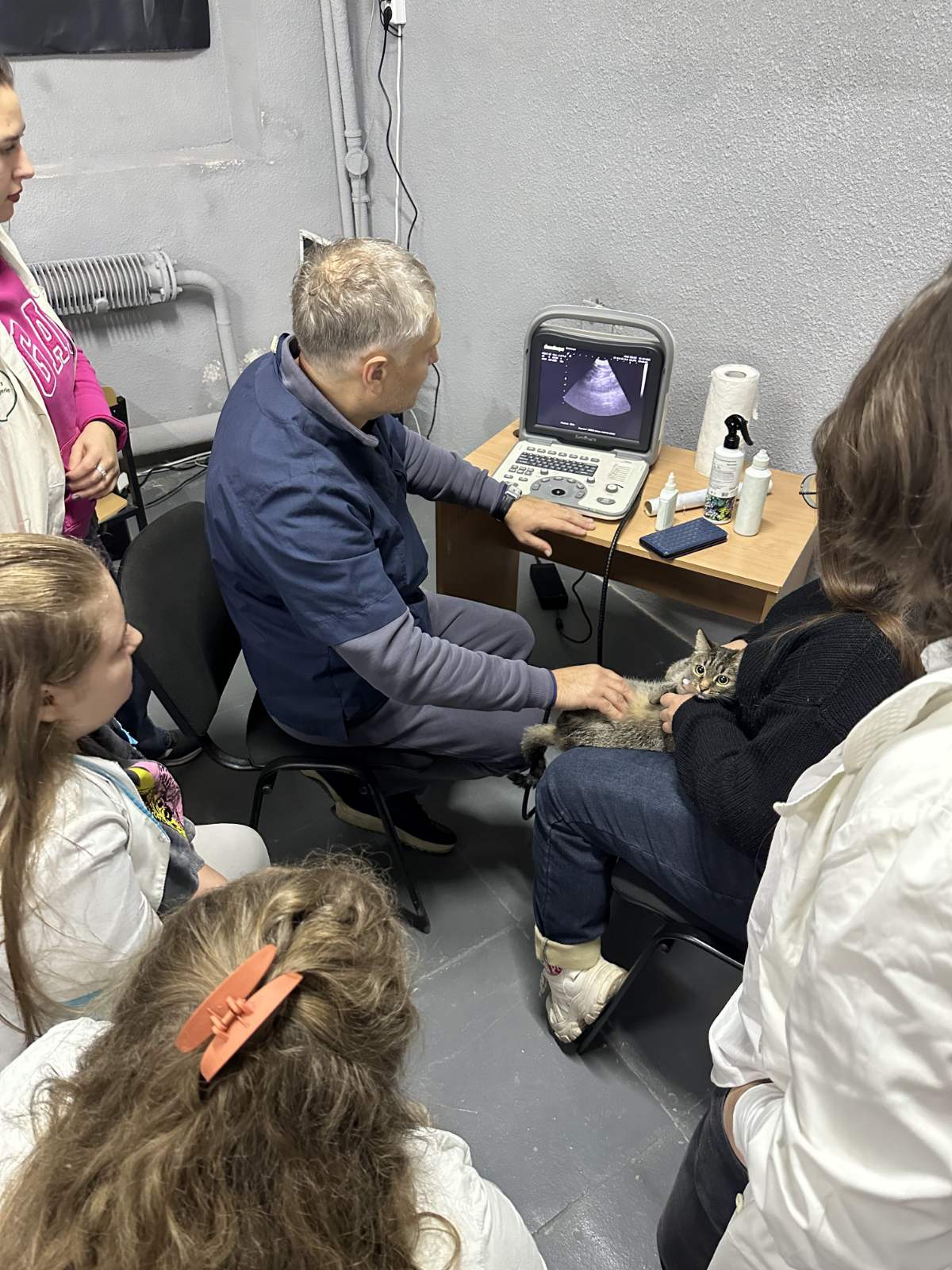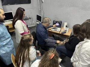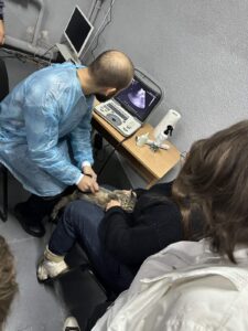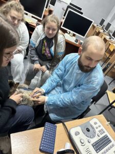 22 жовтня 2025 року відбулось виїзне практичне заняття для здобувачів другого (магістерського) рівня вищої освіти з освітньої компоненти “Візуальна діагностика у ветеринарній медицині“, яке провів професор кафедри внутрішніх хвороб і клінічної діагностики тварин Дмитро КІБКАЛО. Під час заняття студенти засвоїли особливості організації і облаштування кабінету для виконання ультразвукової діагностики, налаштування апарату для проведення даного виду досліджень, отримали практичні навички з ультразвукового дослідження органів черевної порожнини, зокрема візуалізації органів сечовидільної системи (нирок, сечового міхура), печінки та селезінки у дрібних тварин. Кожен студент мав змогу особисто провести ультразвукове дослідження для візуалізації сечового міхура та нирок з метою оцінки їх структури та розмірів у кішки.