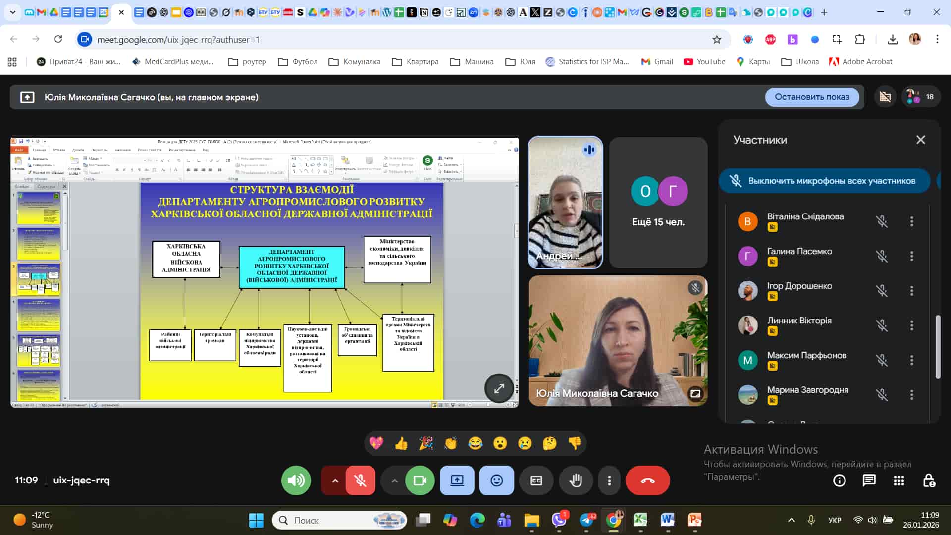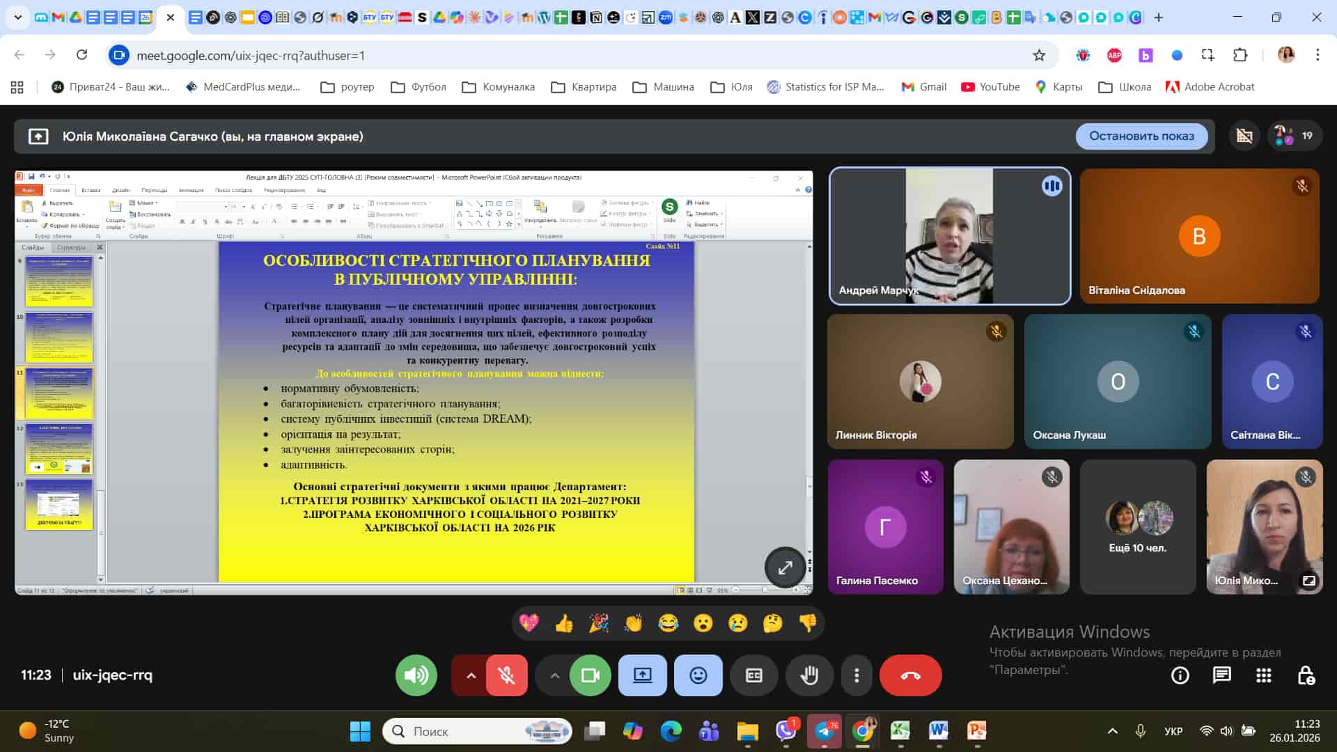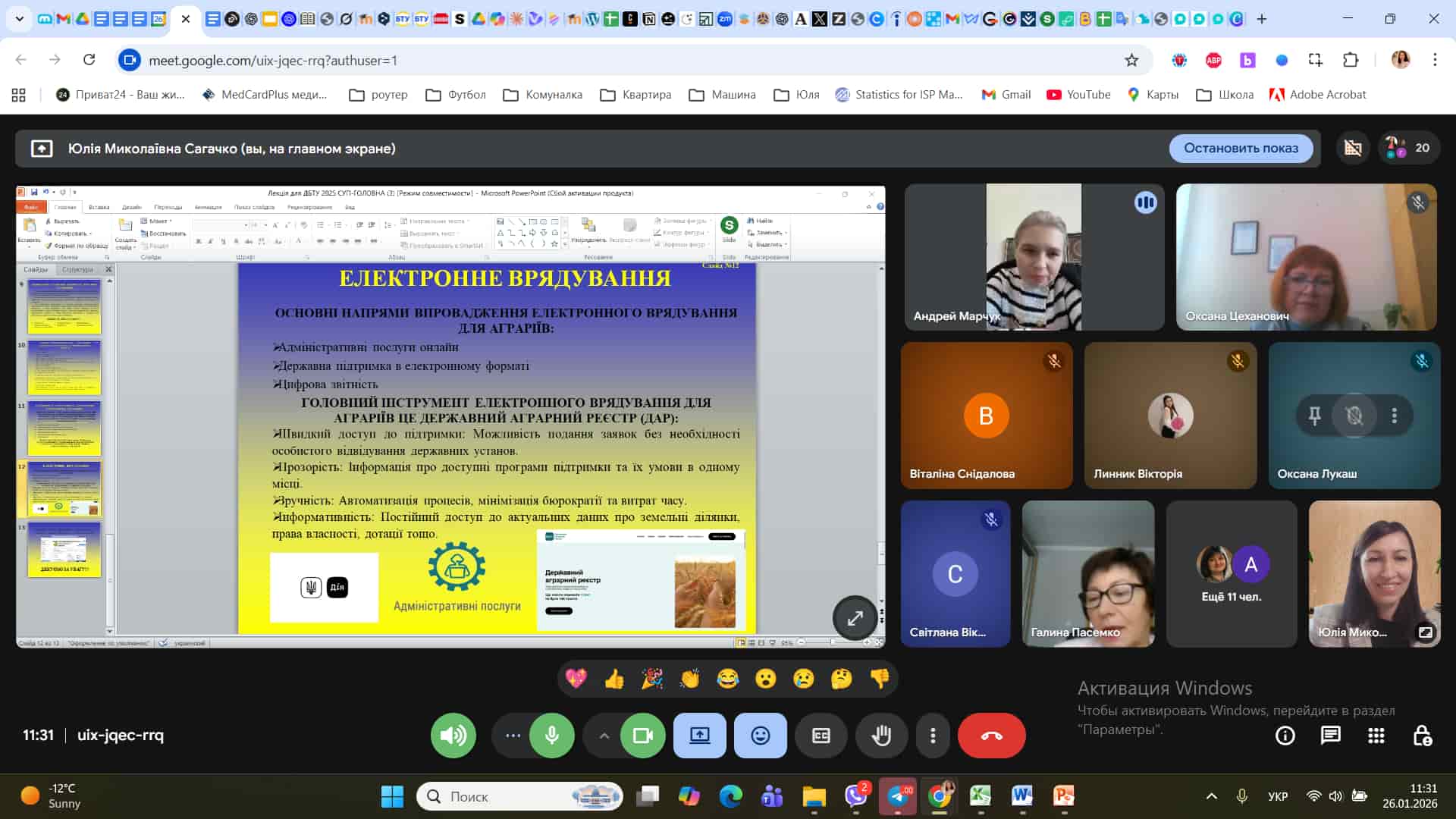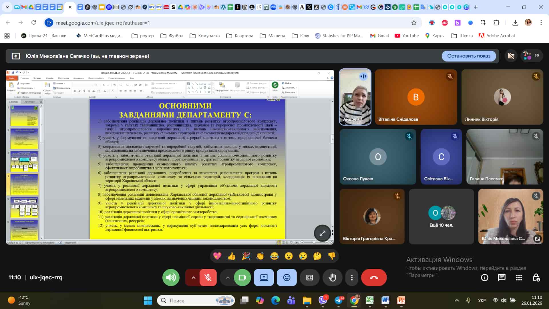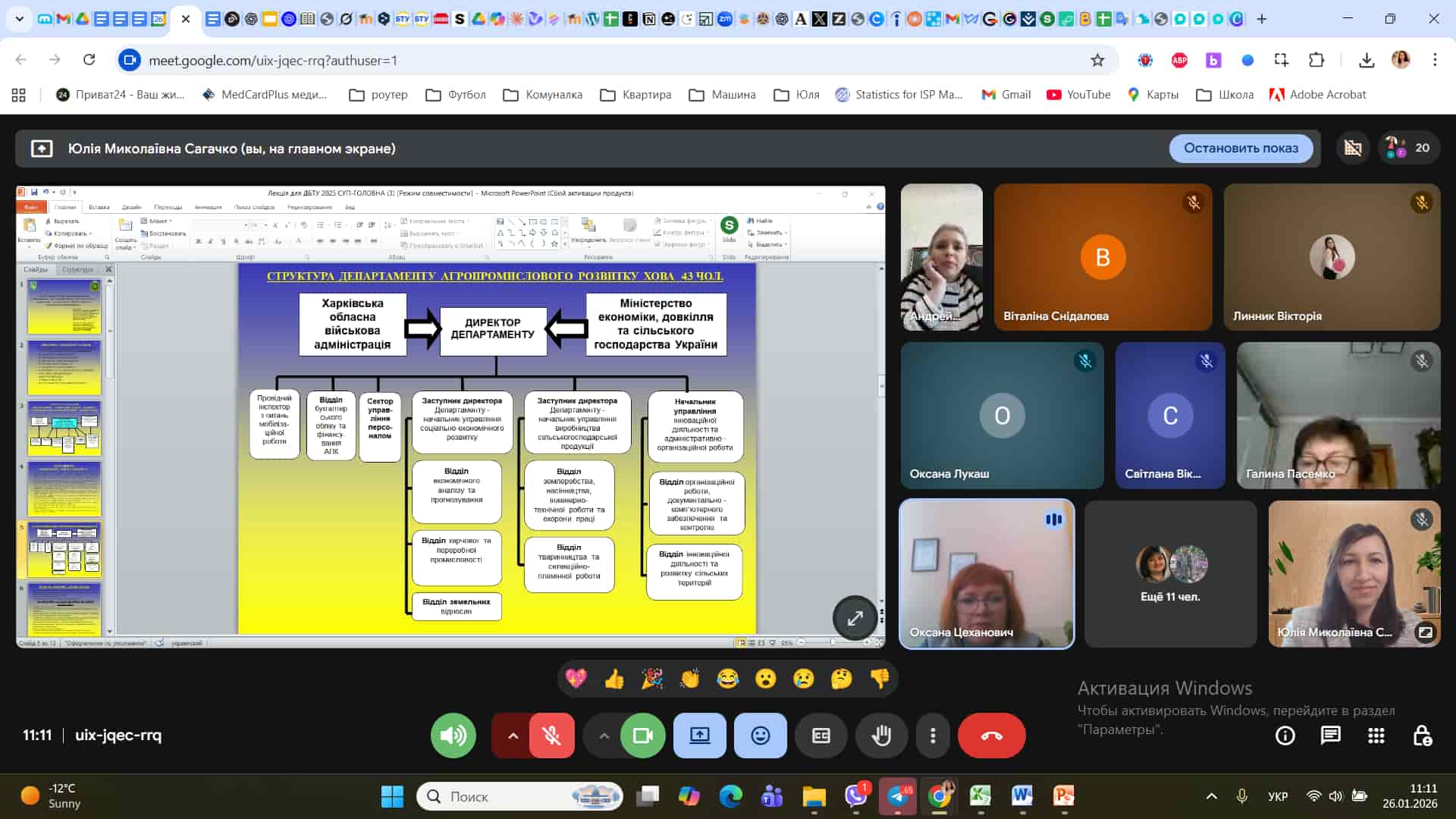 26 січня 2026 року в межах проходження виробничої практики для здобувачів спеціальності D4/281 «Публічне управління та адміністрування» відбулася зустріч із представниками Департаменту агропромислового розвитку Харківської обласної державної (військової) адміністрації. Спікерами заходу стали начальниця управління інноваційної діяльності та адміністративно-організаційної роботи Юлія Марчук і завідувачка сектору управління персоналом Оксана Цеханович.