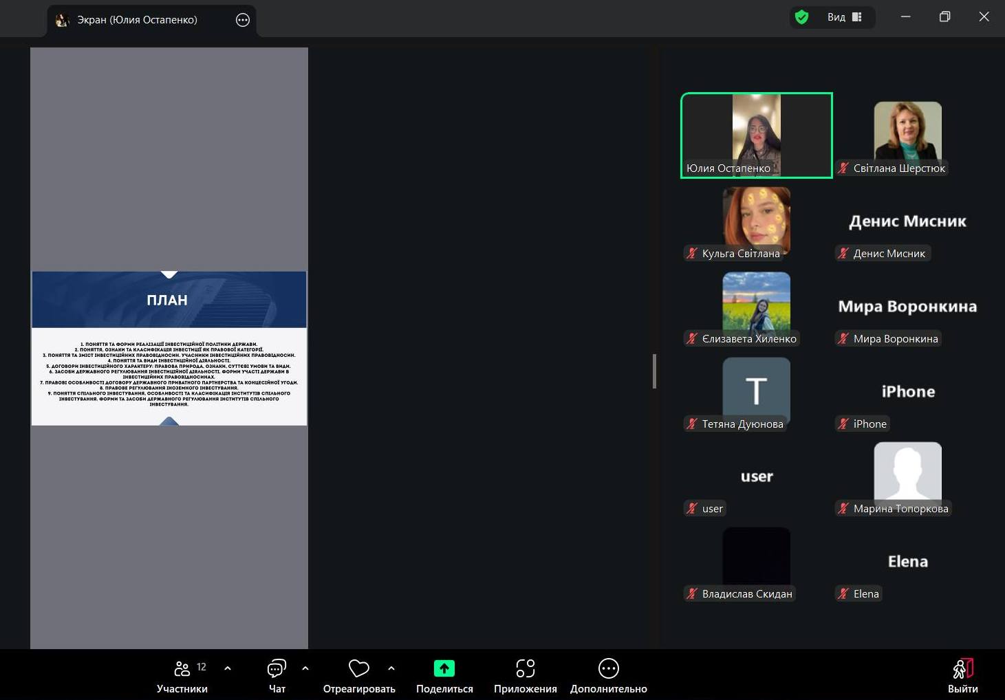 Особливу увагу лектор приділила практичним прикладам застосування норм права, зокрема захисту прав інвесторів у судовій практиці та ролі міжнародних договорів у формуванні інвестиційного клімату держави.