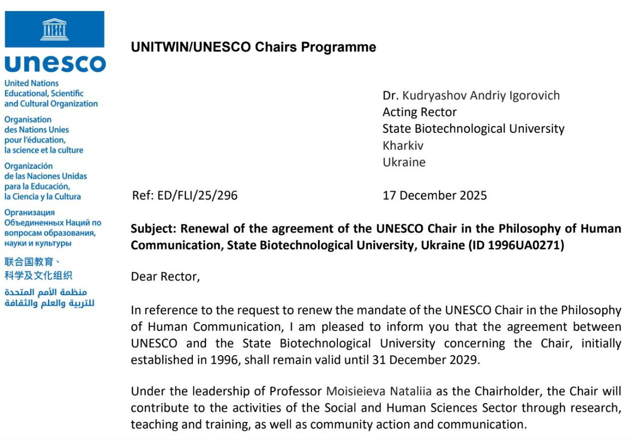 Нове поновлення продовжує термін дії угоди кафедри ЮНЕСКО «Філософія людського спілкування» та соціально-гуманітарних дисциплін до 31 грудня 2029 року.