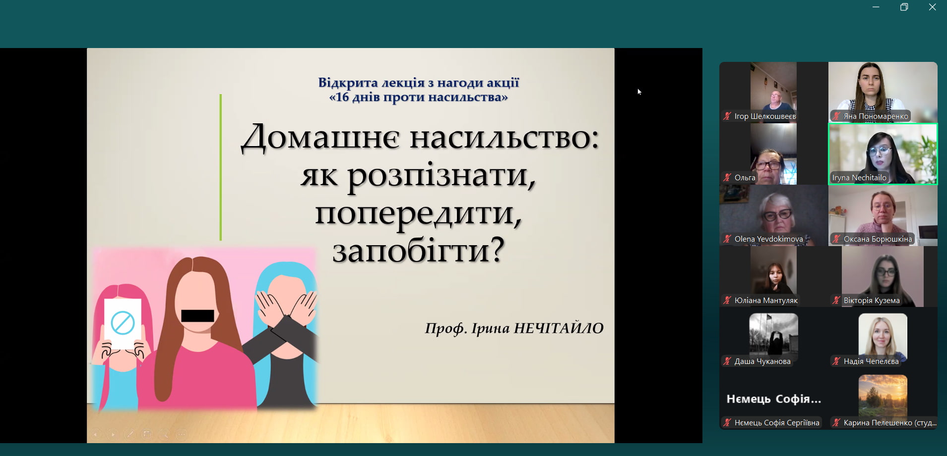 Лекцію підготовлено і проведено проф. Іриною Нечітайло з нагоди початку акції «16 днів проти насильства». Акціє є міжнародною. Її започатковано у 1999 р. Генеральною асамблеєю ООН, яка оголосила 25 листопада «Міжнародним днем боротьби за ліквідацію насильства щодо жінок».