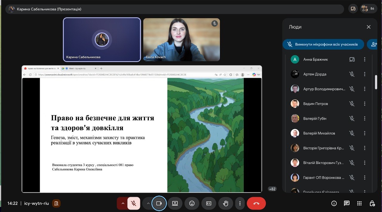 - Сабельникова Карина (студентка 3 курсу, спеціальність 081 «Право») тема доповіді: “Право на безпечне для життя та здоров’я довкілля”