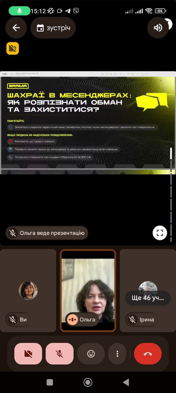 Разом зі спікером Герасименко Ольгою Михайлівною, начальником 1-го сектору Управління протидії кіберзлочинам в Харківській області Департаменту кіберполіції Національної поліції України, обговорили практичні аспекти захисту персональної інформації, дізналися про сучасні виклики у сфері кібербезпеки та отримали фахові рекомендації від експерта, який безпосередньо працює з протидією кіберзлочинам.