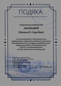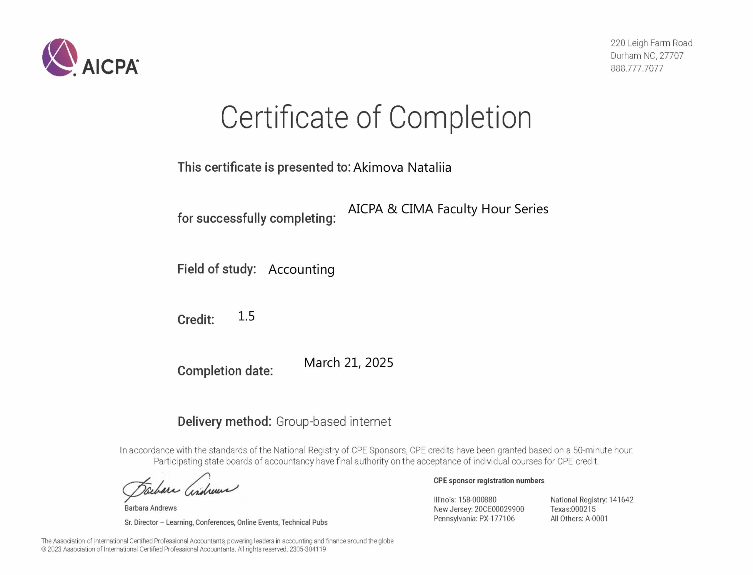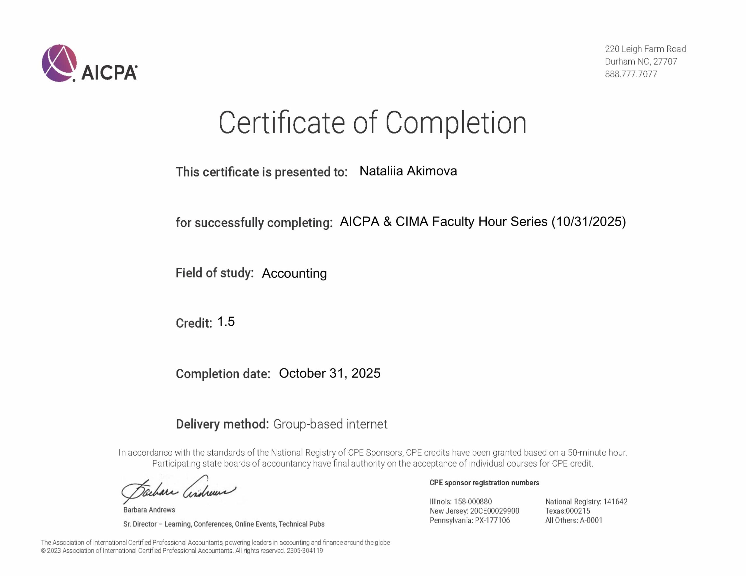- науково-педагогічне стажування «Факультетська година», який проводиться AICPA & CIMA Faculty Hour Series. 31.11.2025р. в обсязі 1,5 кредити ЄКТС, Сертифікат іменний;