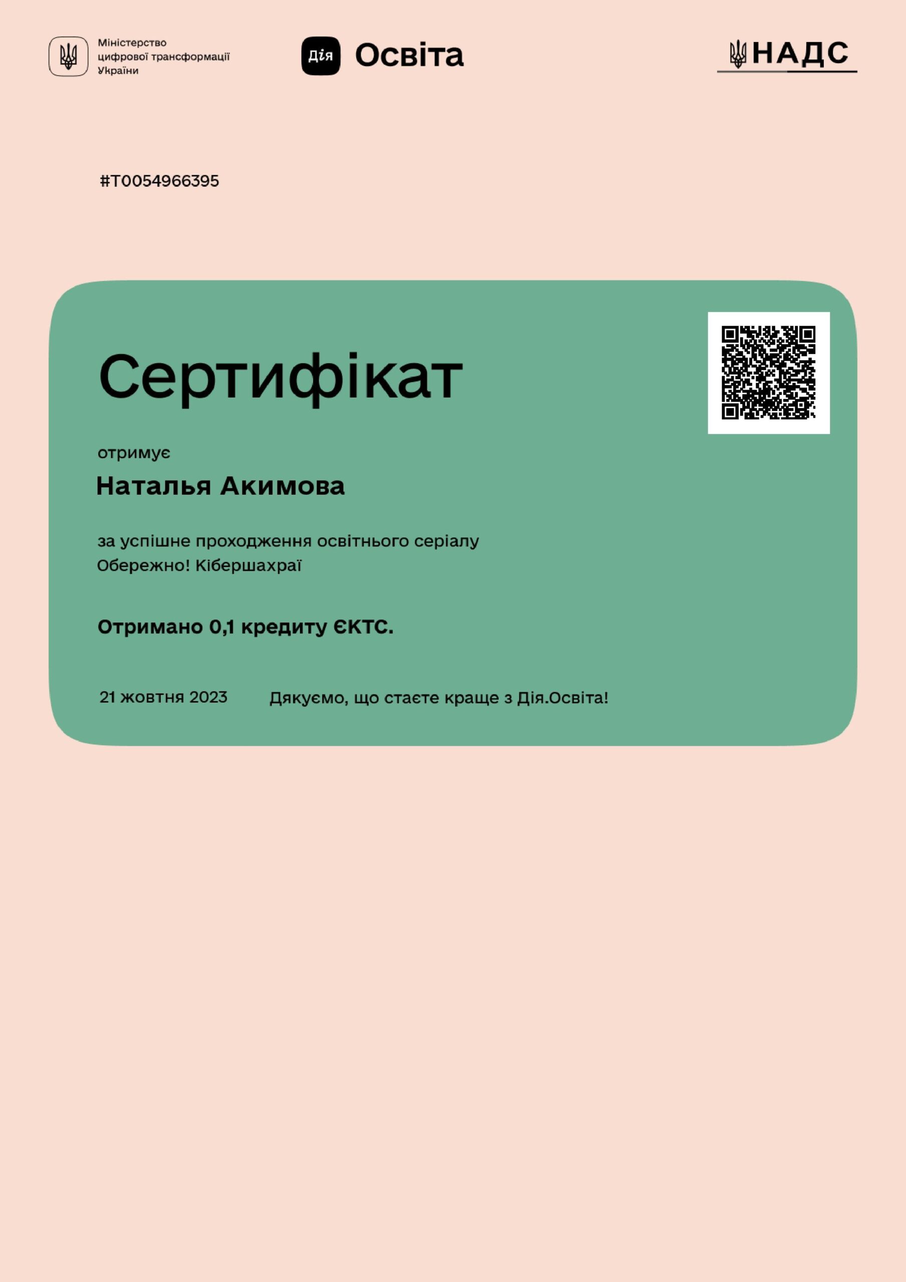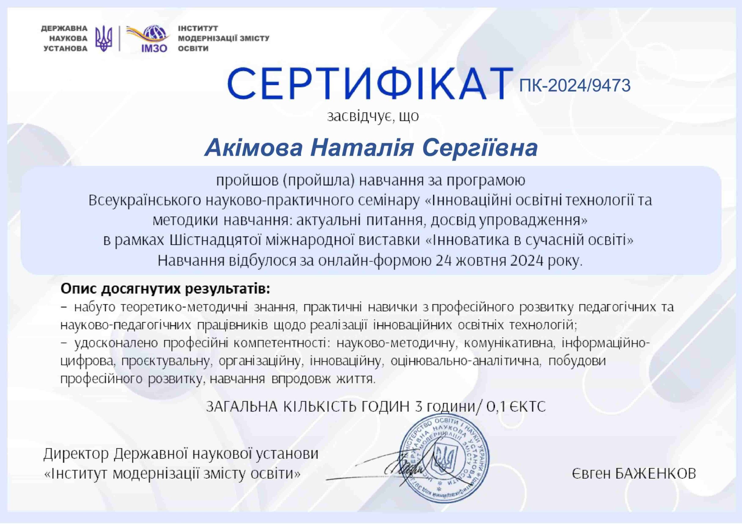 - навчання за програмою Всеукраїнського науково-практичного семінару «Інноваційні освітні технології та методики навчання: актуальні питання, досвід упровадження», 24.10.2024 р. в обсязі 0,1 кредит ЄКТС Сертифікат ПК-2024/9473;