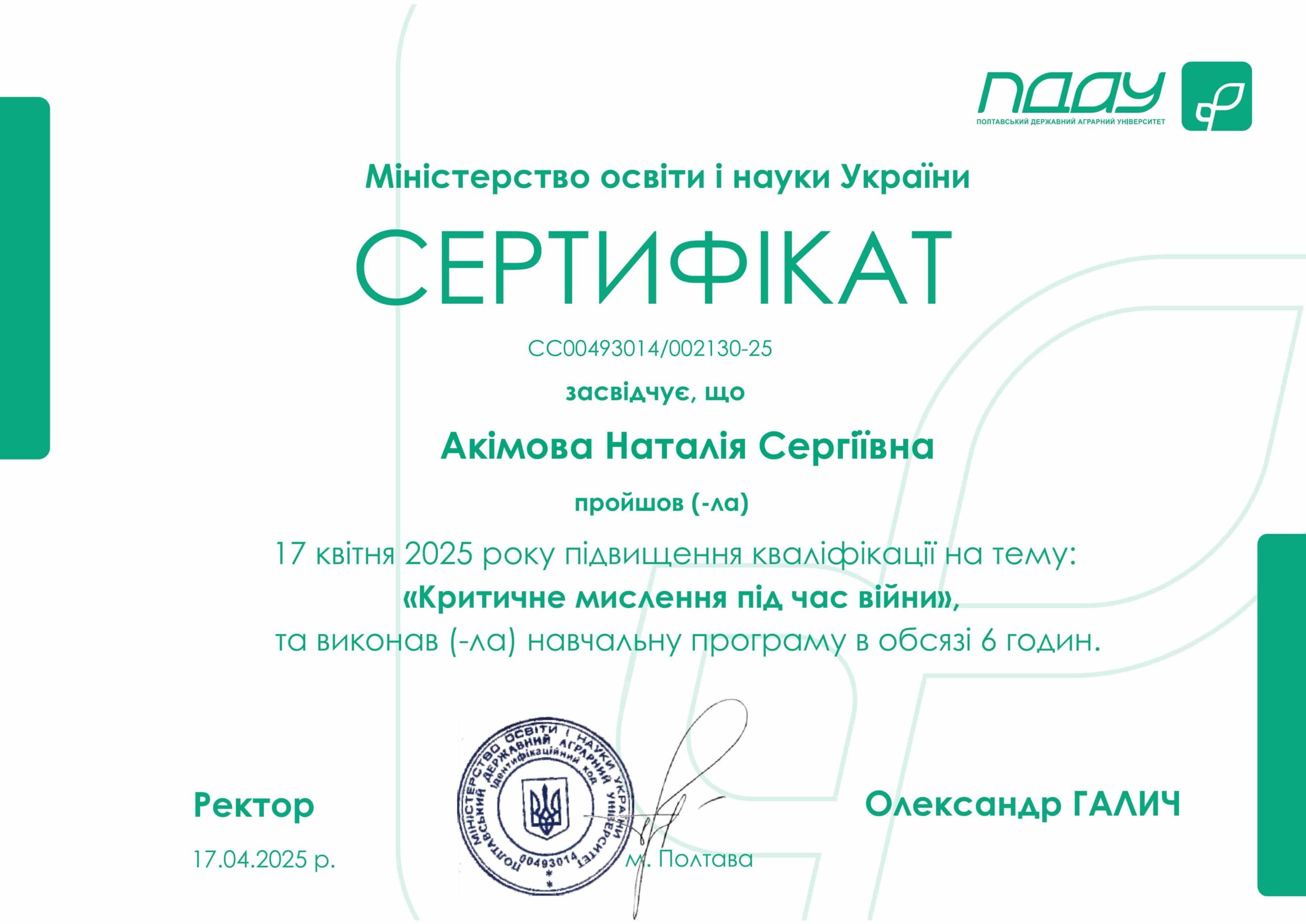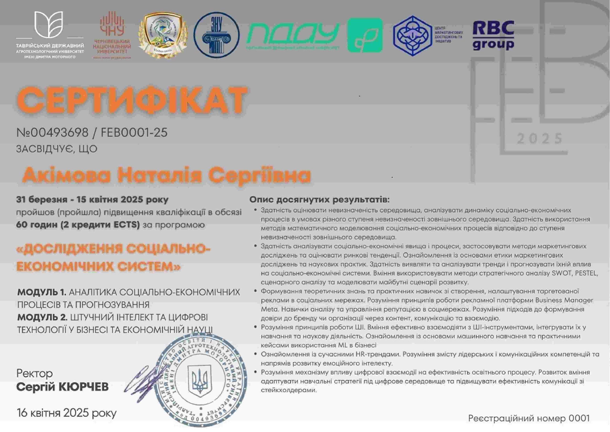 - програма підвищення кваліфікації «Дослідження соціально-економічних систем» терміном з 31.03.2025р. по 15.04.2025р. в обсязі 60 годин (2 кредити ЄКТС), сертифікат № 00493698/FEB0001-25 від 16 квітня 2025р.;