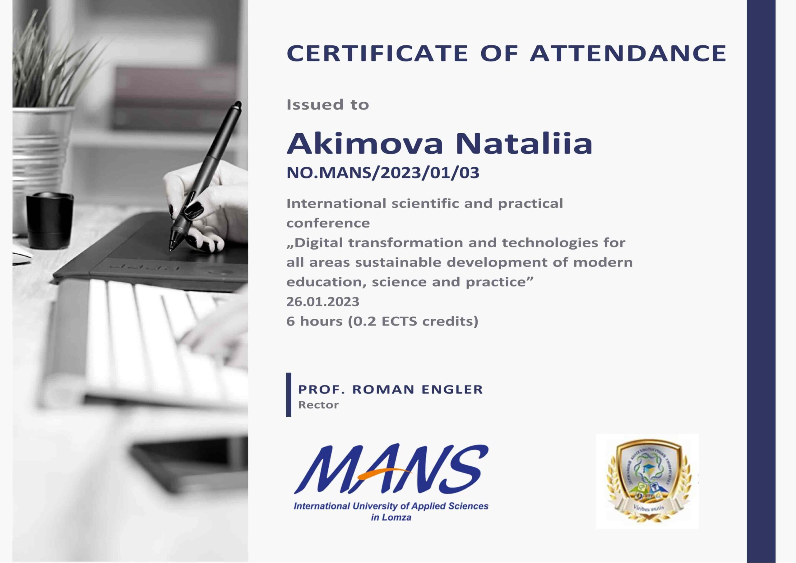- ХІХ Міжнародна школа-семінар «Сучасні педагогічні технології в освіті». Національний технічному університеті «Харківський політехнічний інститут» з 02 по 04 лютого 2022 року, . 0,6 кредита ECTS) Іменний сертифікат