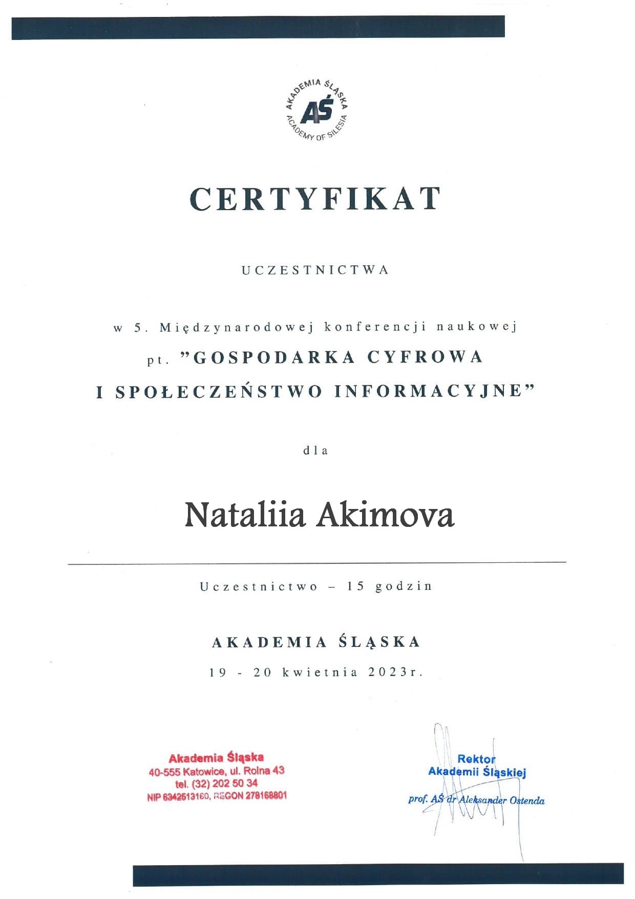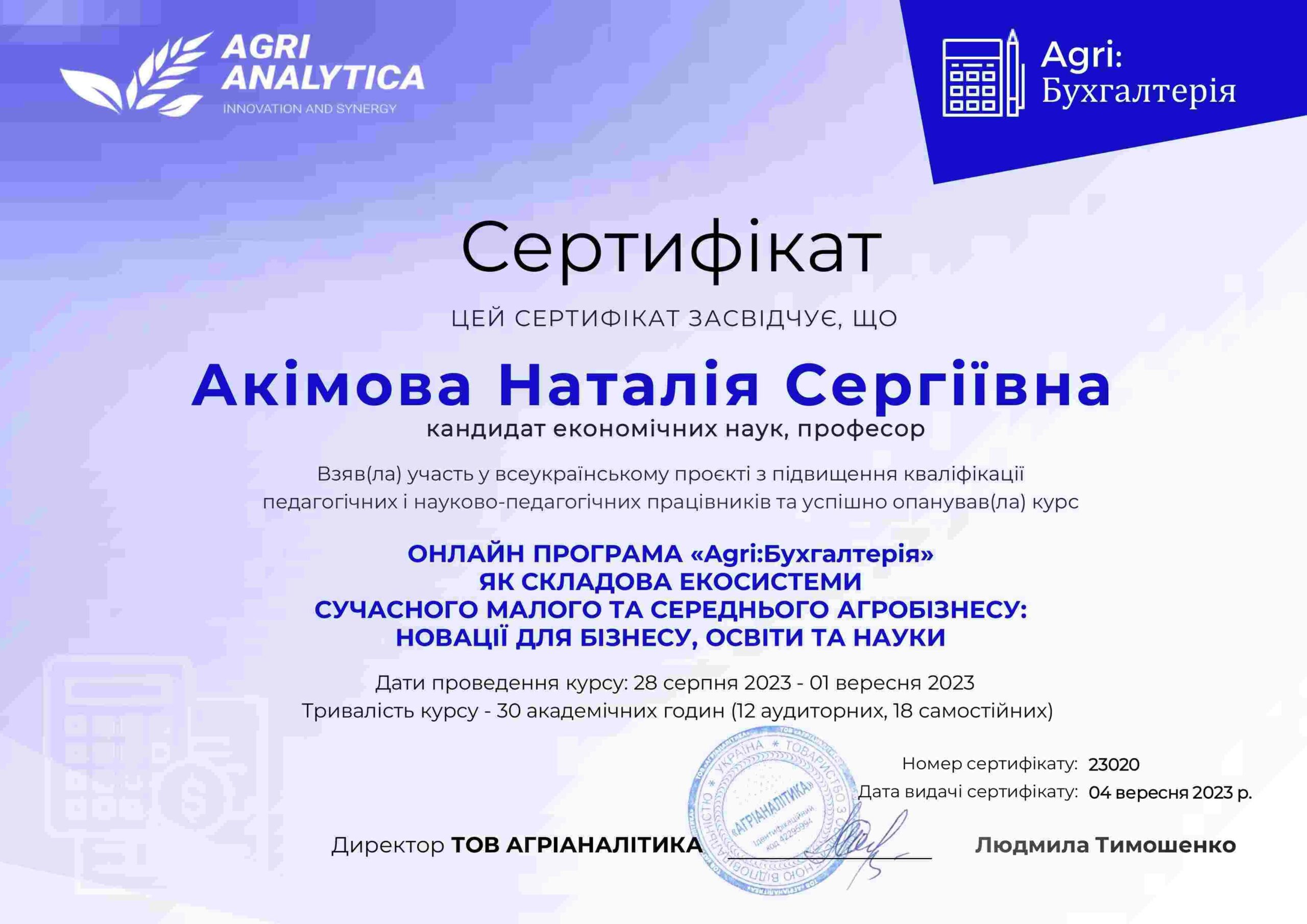 - програма підвищення кваліфікації, підвищення кваліфікації педагогічних і науково-педагогічних працівників на тему «Онлайн програма «AGRI: Бухгалтерія» як складова екосистеми сучасного малого та середнього агробізнесу: новації для бізнесу, освіти та науки», ТОВ «Агріаналітика», сертифікат № 23020 від 04 вересня 2023 року, 1 кредит ЄКТС (30 годин).