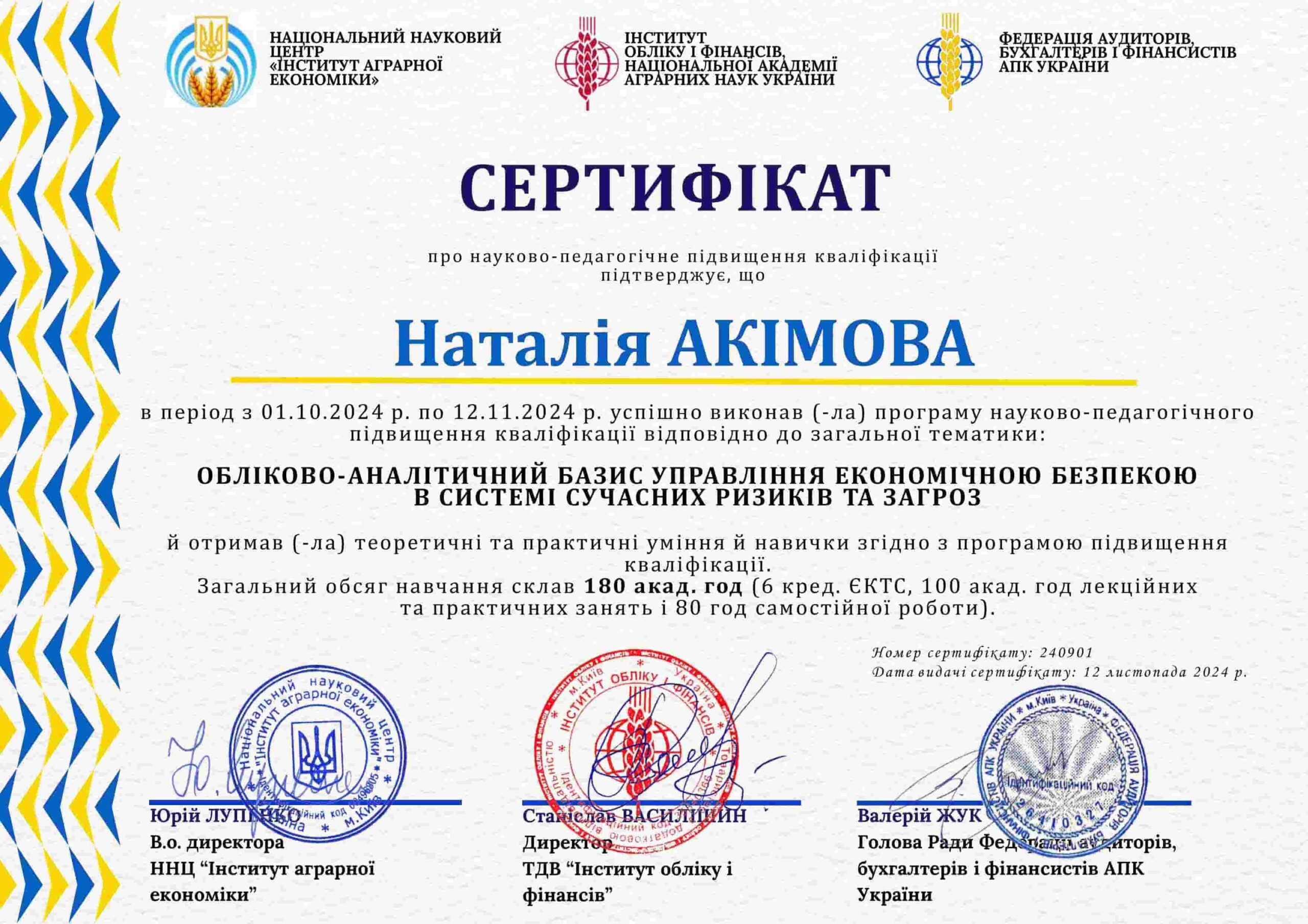 - програма підвищення кваліфікації «Обліково-аналітичний базис управління економічною безпекою в системі сучасних ризиків та загроз», 6 кредитів ЄКТС (180 год.) – ТДВ «Інститут обліку і фінансів», ГО «Федерація аудиторів, бухгалтерів і фінансистів АПК України», ННЦ «Інститут аграрної економіки», сертифікат № 240901 від 12.11.2024 р.;