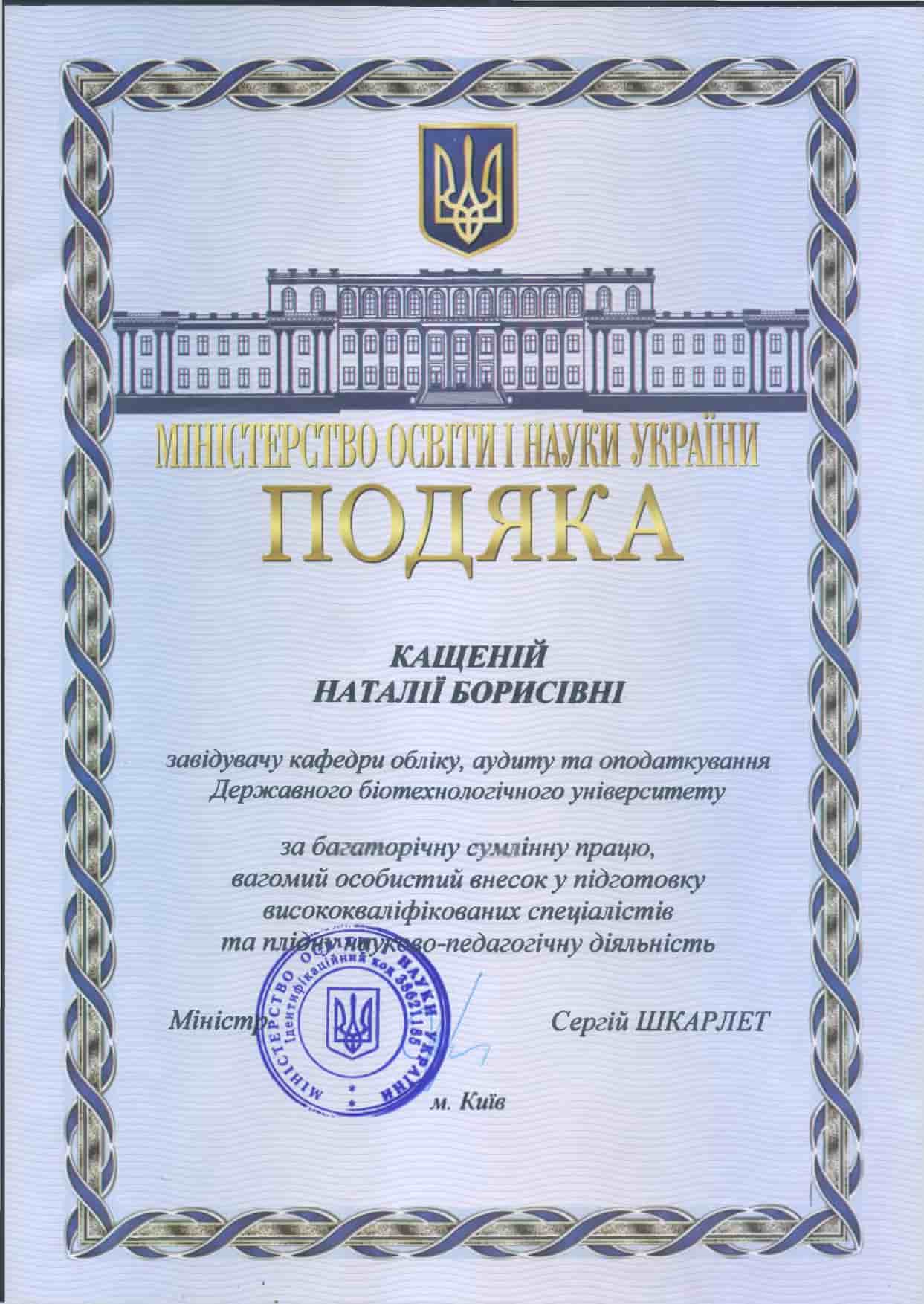 - Грамота Міністерства освіти і науки України (Наказ МОНУ від 10.06.2009 № 498);