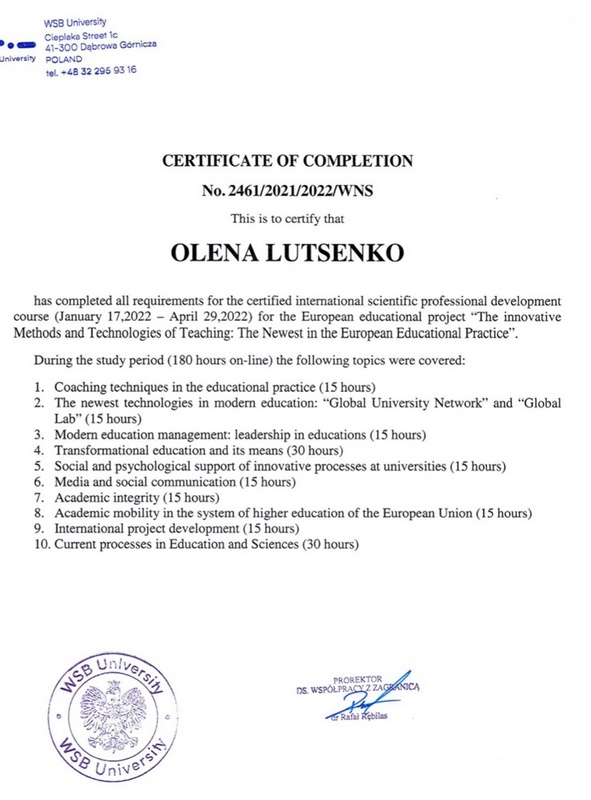 - European educational project «The innovative Methods and Technologies of Teaching: the Netwest in the European Educational Practice», Certificate № 2461/2021/2022/WNS, January 17, 2022-April 29, 2022), Poland