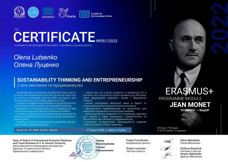 - Міжнародний проект програми ЄС ЕРАЗМУС+ Модуль Жана Моне «Стале мислення та підприємництво» (Step UP 101080031, 2023р.)