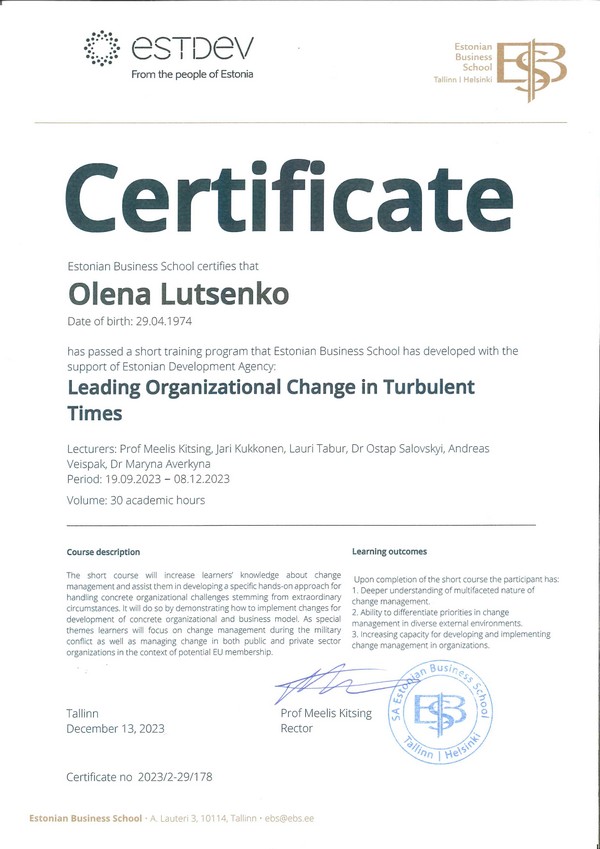 - Estonian Business School Certificate 2023/2-9/178 Leading Organizational Change in Turbulent Times (19/09/2023-08.12.2023) 1 кредит ECTC (30 годин);