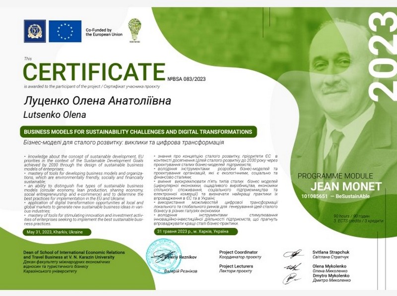 - Міжнародний проект програми ЄС ЕРАЗМУС+Модуль Жана Моне «Бізнес -моделі для сталого розвитку» (Step UP 101085651, 2023р.).