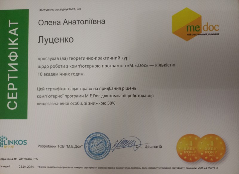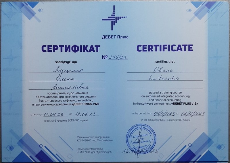 - курс підвищення кваліфікації з автоматизованого комплексного ведення бухгалтерського та фінансового обліку в програмному середовищі “ДЕБЕТ ПЛЮС v12” p 11.-4.23-12.06.2023р. 345/23 3 кредити ECTS (90 год.);