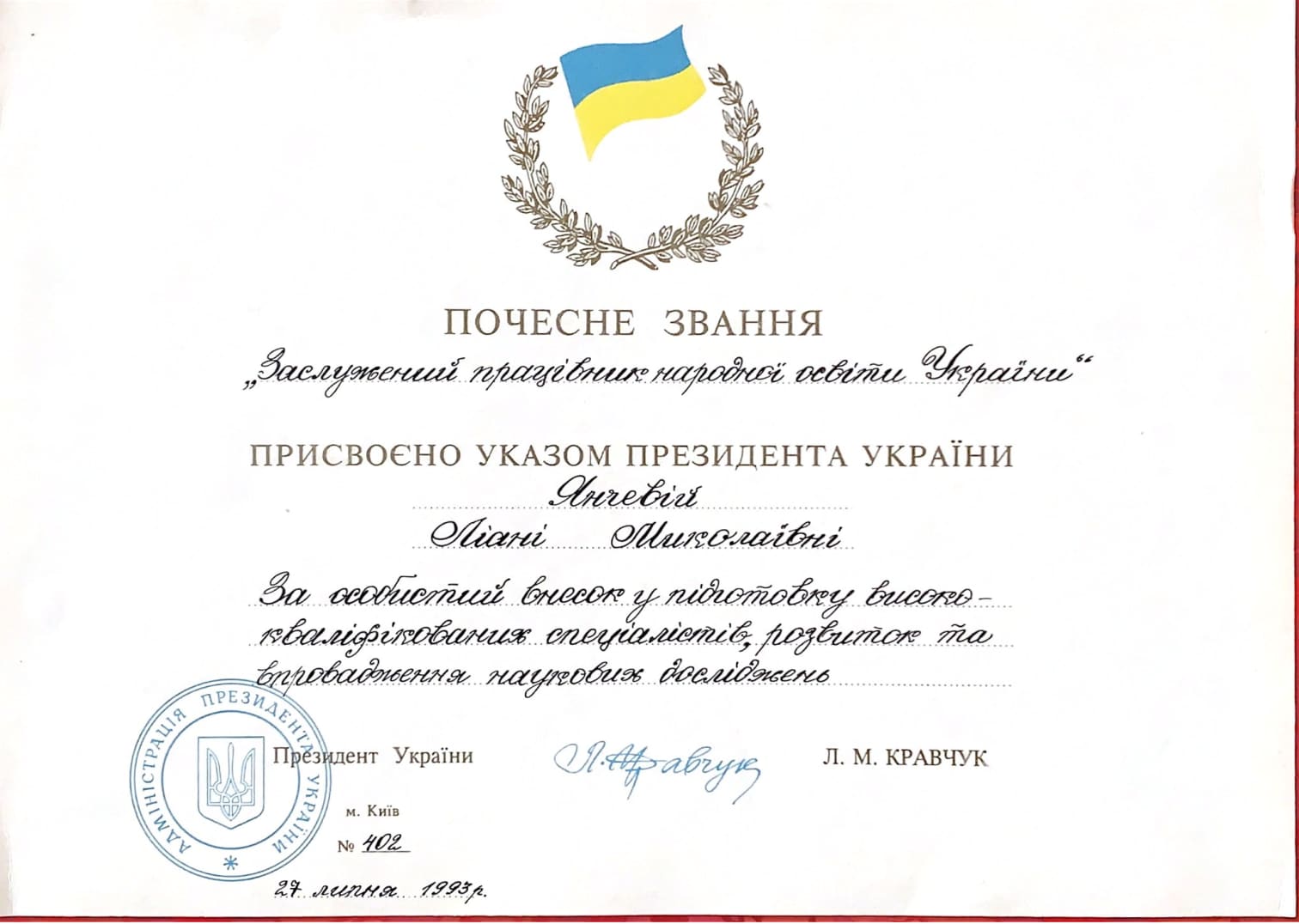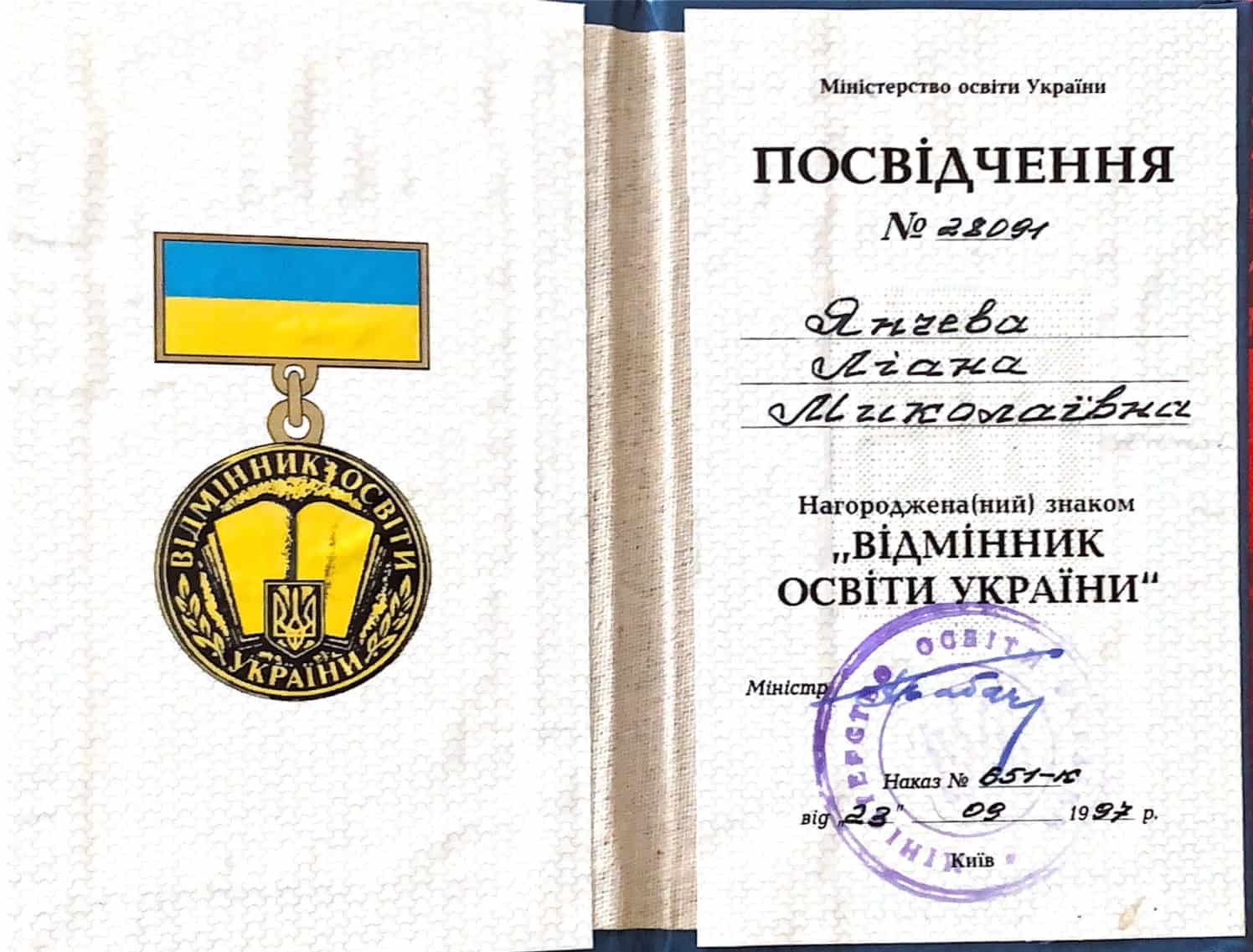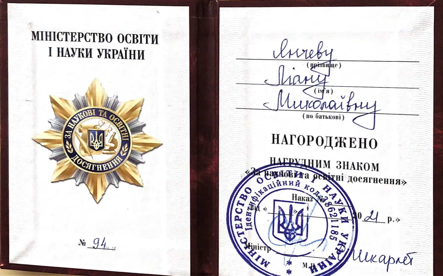 - 2021 р. – Нагрудний знак МОН України «За наукові та освітні досягнення»