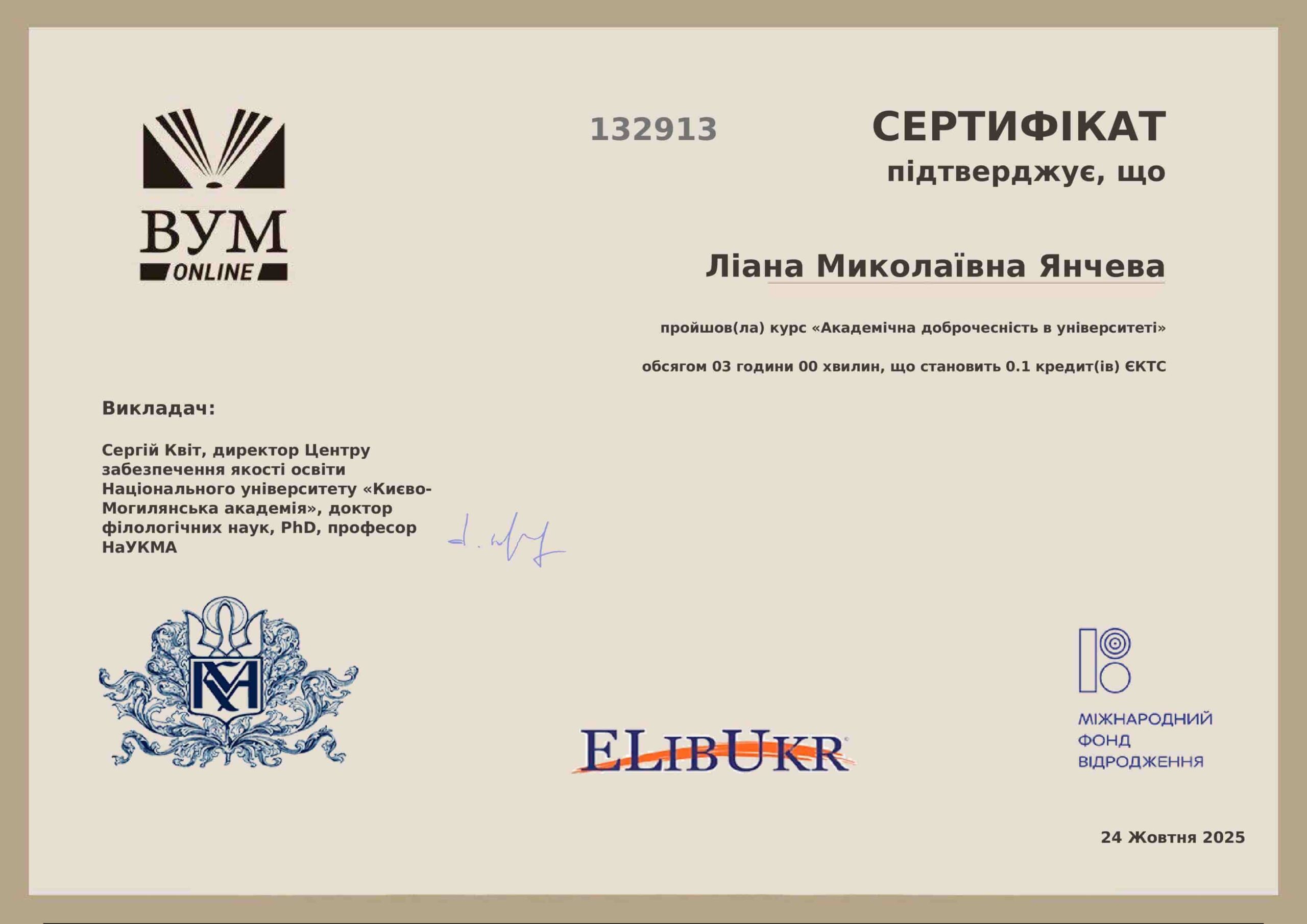 - курс «Академічна доброчесність в університеті», 24.10.2025р. 0,1 кредита ЄКТС, сертифікат 132913;