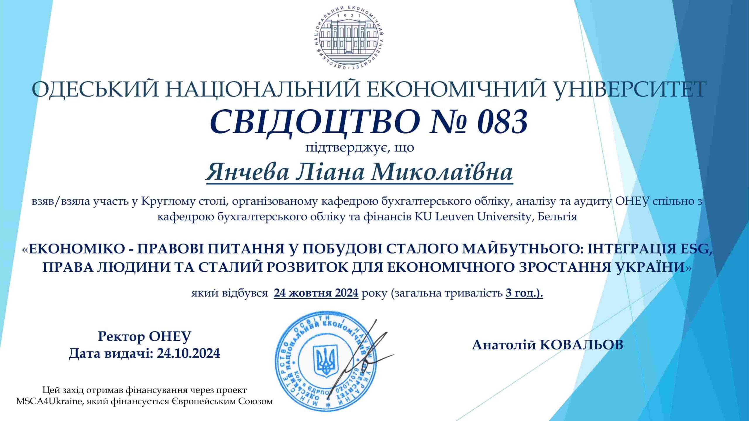 - серія годин круглого столу, який проводився кафедрою бухгалтерського обліку, аналізу та аудиту ОНЕУ спільно з кафедрою бухгалтерського обліку та фінансів KU Leuven University, Бельгія «Економіко-правові питання у побудові сталого майбутнього: інтеграція ESG, права людини та сталий розвиток для економічного зростання України».24.10.2024р.в обсязі 0,1 кредит ЄКТС, свідоцтво №083;