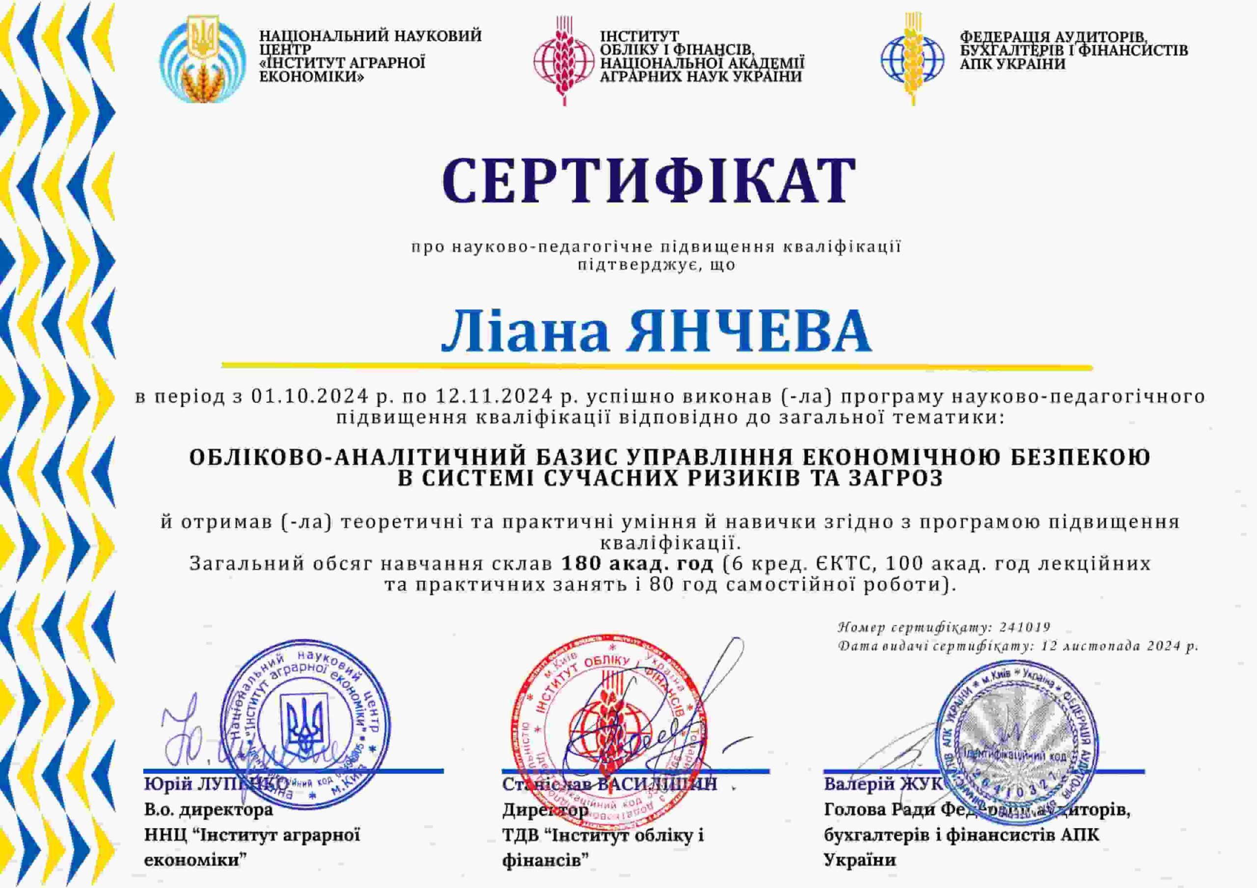- програма підвищення кваліфікації «Обліково-аналітичний базис управління економічною безпекою в системі сучасних ризиків та загроз», 6 кредитів ЄКТС (180 год.), сертифікат № 241019 від 12.11.2024 р. – ТДВ «Інститут обліку і фінансів», ГО «Федерація аудиторів, бухгалтерів і фінансистів АПК України», ННЦ «Інститут аграрної економіки»;